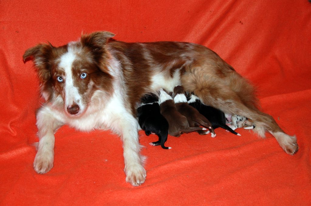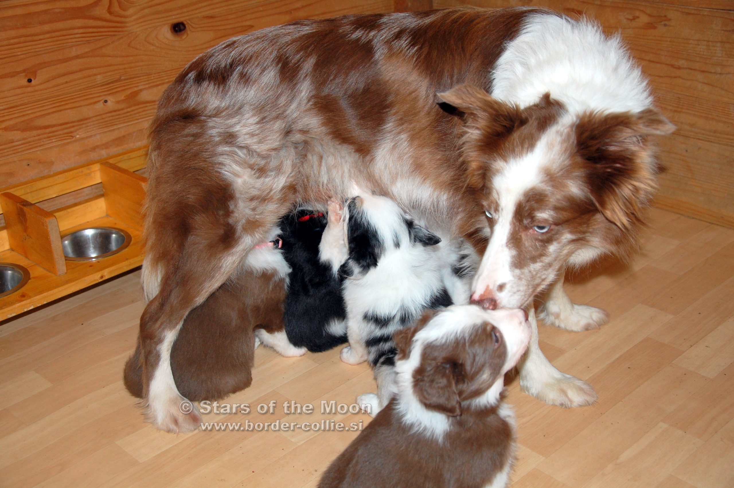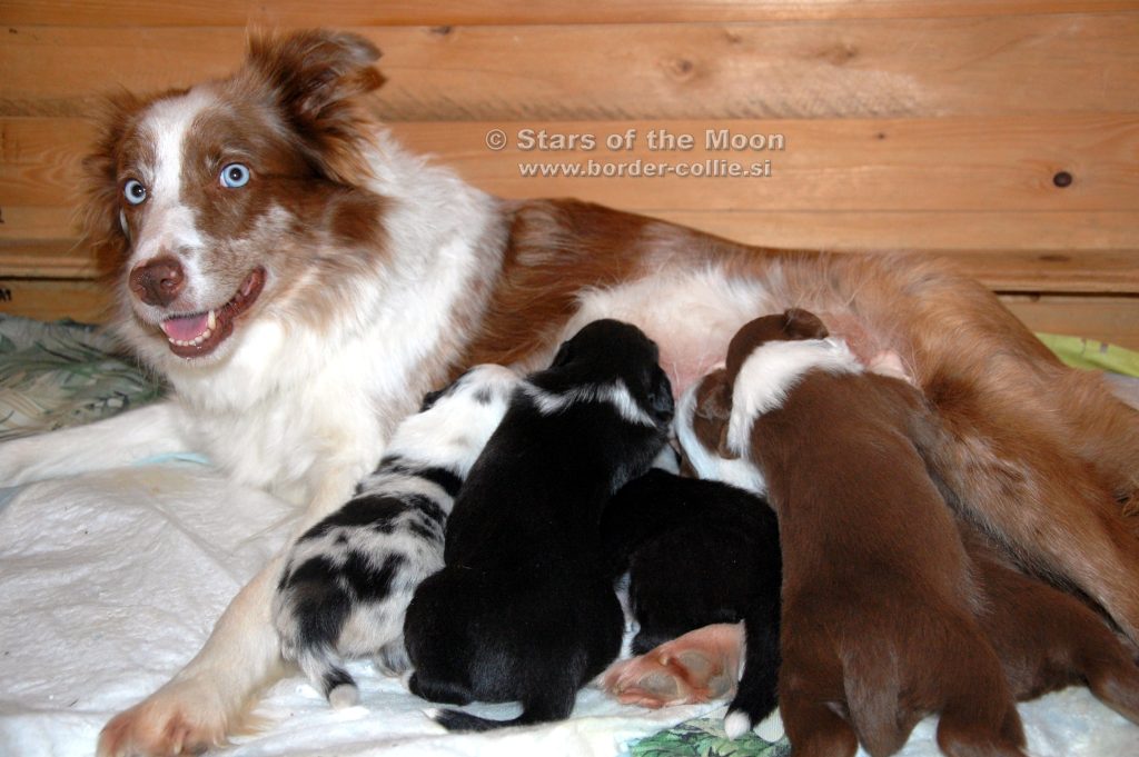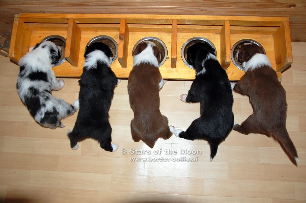 Aktiven teden za našimi mladički! Ob dopolnjenem 4. tednu starosti so začeli vidno napredovati v motoriki in koordinaciji, postajajo vedno bolj igrivi in razposajeni, pričeli pa so se navajati tudi na svojo hrano – seveda pa so še vedno zelo navezani na svojo mamo Maggie! Njihove posamične fotografije: Leglo E